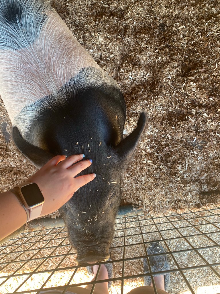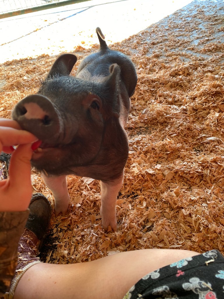 My sister’s pig Tramp getting a treat from me at the end of February.