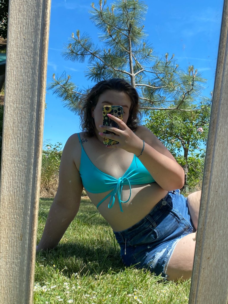 A photo of me in a bikini top from my best friend’s cousin’s bikini business. (check it out! @kairos.kinis on Instagram)