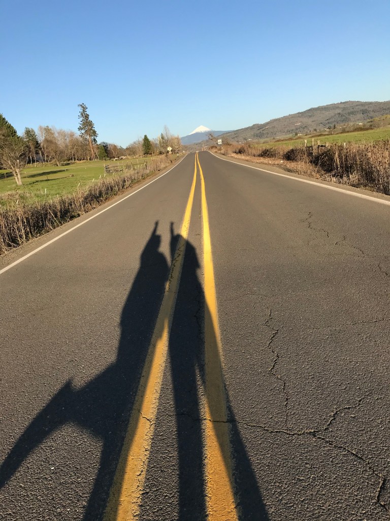 My best friend’s shadow and mine on an empty road in late March.