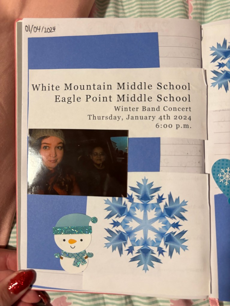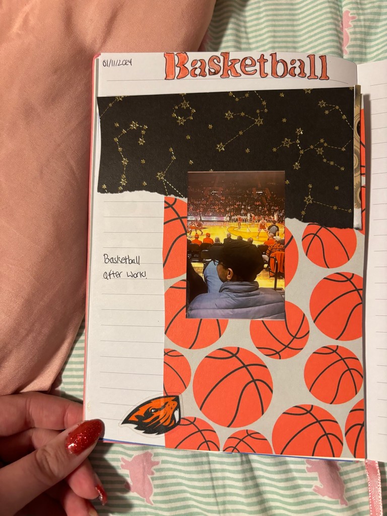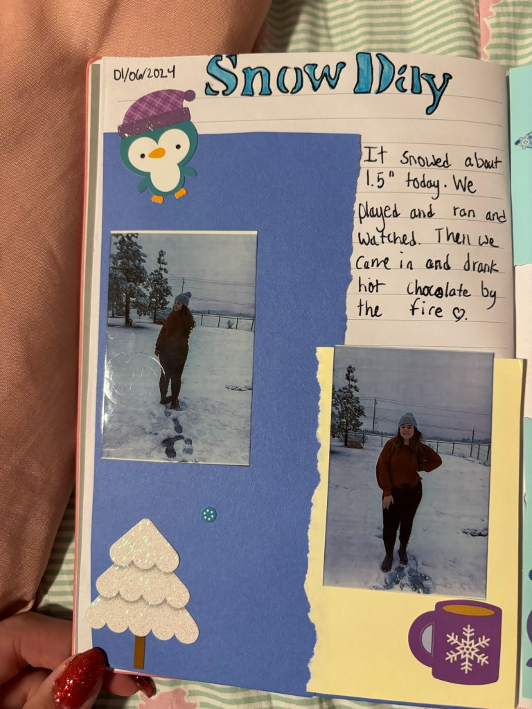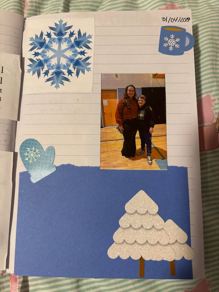 The first page of my sister’s band concert. My sister and I before the concert started. Second page of my sister’s band concert, a photo of my sister’s best friend’s little brother and I.Snow Day while I was still home for Winter break.Here is a page about the first day of Winter term. My friend Ari and I before our first class, and then my second class. A nice basketball spread right after I had work.